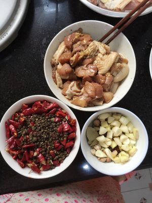 鸡肉切小块,加入一点盐,生抽,五香粉,料酒,少许淀粉拌匀腌制半小时,干辣椒切段,姜蒜切小丁