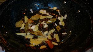 接着呢放入少许香料,八角两个,香叶几片,小火炒香