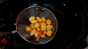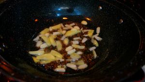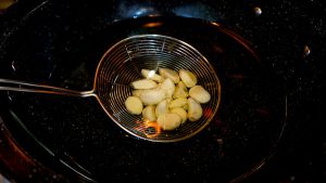 锅里上油,烧指五成热,,放入剥好皮的大蒜进去炸至