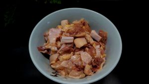 鸡块放入一个大的容器内,放入两勺生抽,一勺料酒,少许盐,在放入适量的生粉,用手彻底搅匀,腌制15到二十分钟