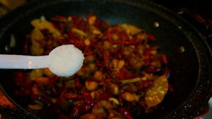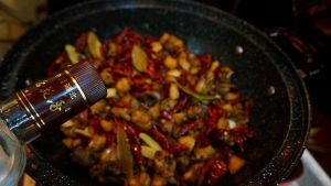 中火快速翻炒,炒到中翅肉收紧,加入少许糖,使得辣后回甜,口感更丰富。