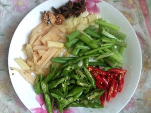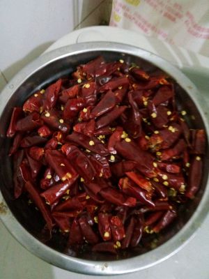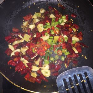 另起一锅 热锅 放油 把辣椒干花椒八角香叶放入炒出辣味