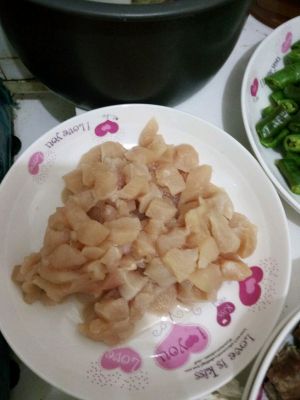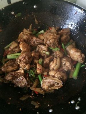 油温冒烟,找下草果八角,炒出香味在放姜、大蒜、青辣椒翻炒几次之后倒入鸡肉大火翻炒,翻炒10分钟左右加入酱油、朝天辣、花椒、盐半勺,味精半勺,继续翻炒一分钟。