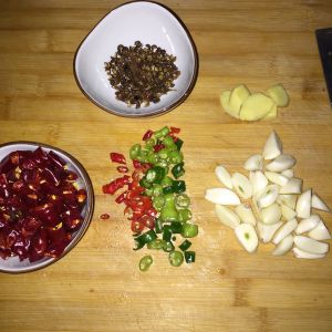 干辣椒切段,花椒,青椒红椒切圈,姜切片,蒜备用
