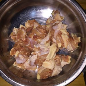 鸡切小块 拇指大小 因为我在英国没办法自己砍 所以这次做的是用小鸡翅