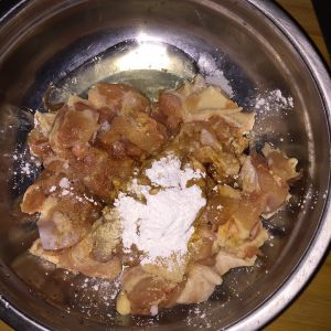 放入鸡块 再倒入腌鸡块的调料 不停翻动鸡块 至到鸡块完全入味变干