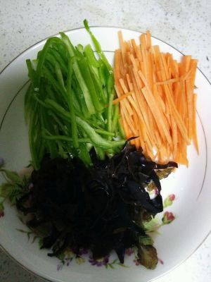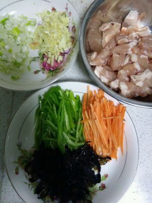 木耳、胡萝卜、青椒切丝,葱、姜、蒜切末备用。