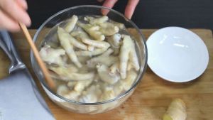 冷水下锅,将生姜拍扁,蒜拍扁,倒适量黄酒,放凤爪绰水15~20分钟
