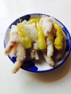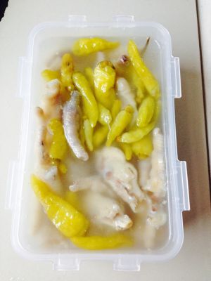 最后把凤爪放入容器中,导入醋200克,泡椒100克,盐3勺、糖2勺,密封好,1-2天后即可食用