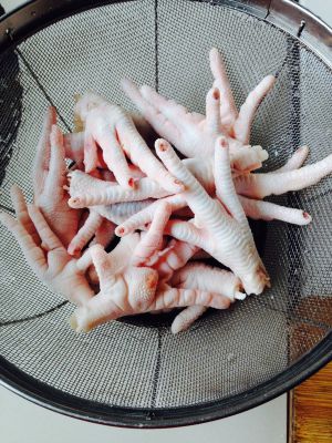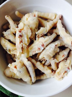 先将鸡爪洗干净(要完全解冻才可以,要不然鸡爪煮过之后会变黑就不好看了)