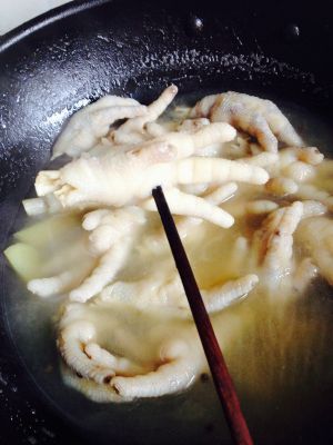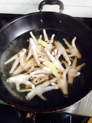 锅内倒入适量水烧开后倒入鸡爪,少许花椒,几片姜,适量黄酒