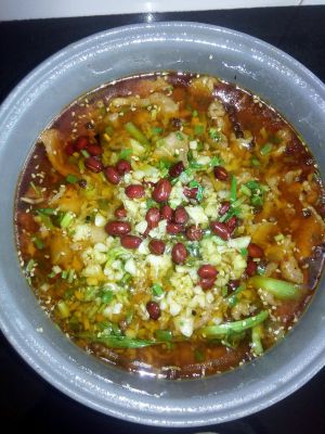 将锅烧热,倒入油烧制冒青烟关火,将油倒入放有花椒和海椒面的肉片中,瞬间了闻到一道扑鼻的香