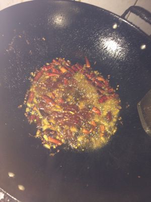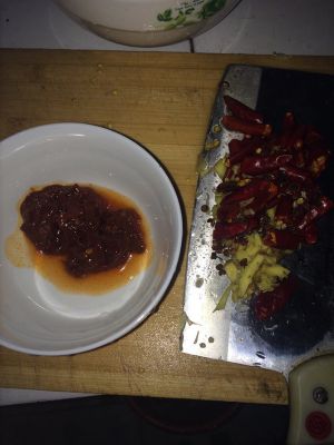 开大火将锅烧热冒青烟,倒入大量的油,等油烧到五成热时,放入切好的佐料,开小火炒香,再加入豆瓣,不断翻炒,等香味出来,向锅里倒入半碗水,开大火烧沸