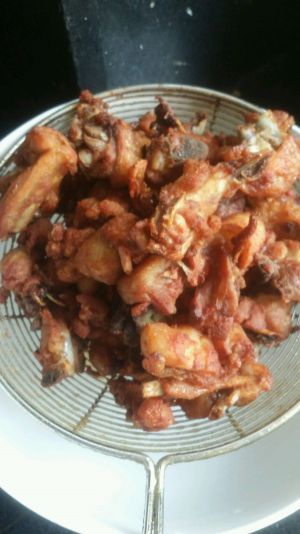 2.倒入油,到八成热的时候放入鸡块炸至呈深黄色,就是外表没有水份,颜色加深的时候即可捞出控油!