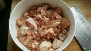 鸡腿剔骨切块,用生抽老抽料酒耗油淀粉适量,充分搅拌后腌半个小时左右。