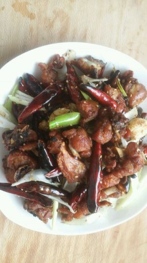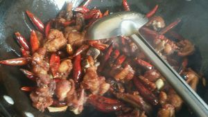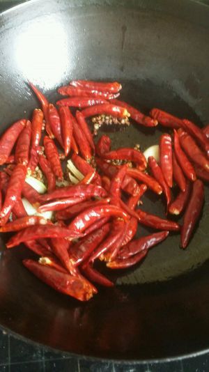 锅里还有油,放花椒和姜,炒香后再放辣子,辣子也炒香后,鸡块加到里面一起炒。