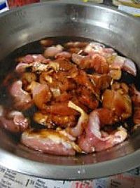 鸡腿拆骨切块,加入酱油,料酒,腌渍过夜