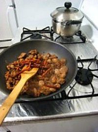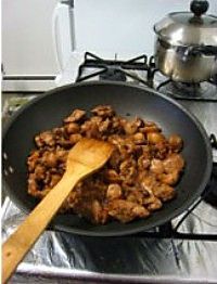 把腌渍好的鸡肉放入锅内煸炒, 沥去多于的汁水,煸炒直到鸡肉表面变焦