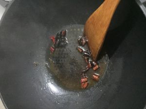 热油锅中加入蒜,姜,辣椒干,爆香。