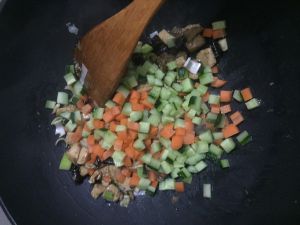 起锅烧油,油热加入干辣椒,小花椒,10秒后加入萝卜丁爆炒断生。然后乘出备用