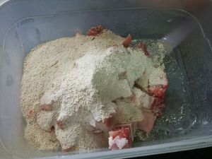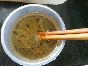 盐、鸡粉、油、生抽、老抽、水、姜和均倒入粉和肉里拌匀。