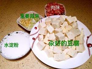 准备食材:豆腐 肉末 蒜末 姜末 花椒 干辣椒 葱花 淀粉