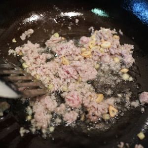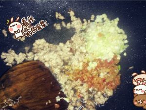 然后下肉末翻炒均匀