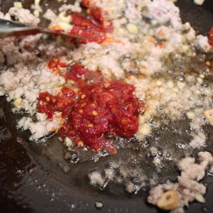 油热后葱姜蒜爆香 加入辣椒酱 期间火不要太大