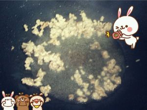 锅中比平时炒菜多放些油~放入牛肉末炒散~