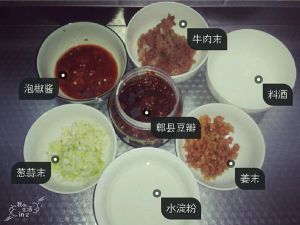 葱姜蒜切成末~牛肉也剁碎~准备水淀粉~料酒~剁椒酱~郫县豆瓣~