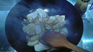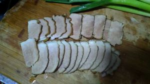 猪肉捞出洗净晾凉切片。切片大小因人而异,一般大一些比较过瘾。肉片切薄,但不要太薄,3毫米厚比较合适,太薄炒制后易过柴。