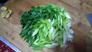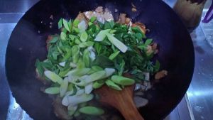 放入蒜苗,少许泡发好的黑木耳,快速翻炒,青蒜断生即可出锅。