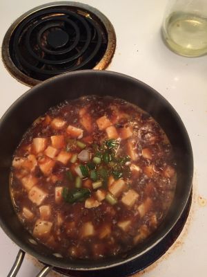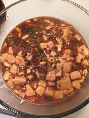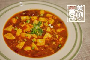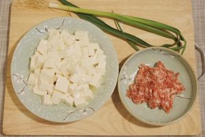 准备材料:豆腐切丁、牛肉切末、豆瓣酱、盐、酒、干红辣椒碎、青蒜、姜末、花椒粉、水淀粉、酱油、少许糖。