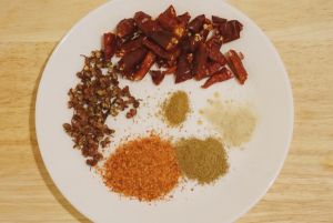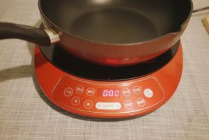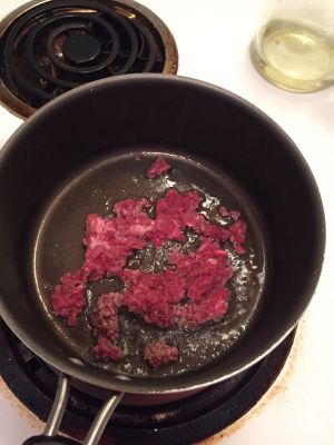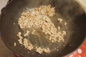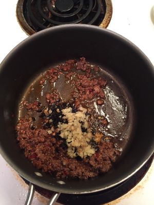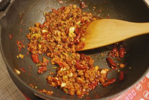 锅内加少许菜油,大火加热,油热后依次加入豆瓣酱、盐、干红辣椒、青蒜、姜末、花椒粉、牛肉末、也可将牛肉末用上述调料腌好后一并加入。 炒香。