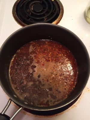 待豆腐熟后,改大火,加入由水淀粉、糖、酒、味精、酱油调好的芡汁。待芡汁均匀附着后,关火,起锅。