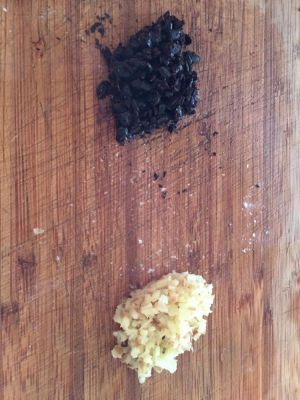 将豆豉剁碎,姜去皮洗净切末,青蒜去老叶去根须洗净切段。