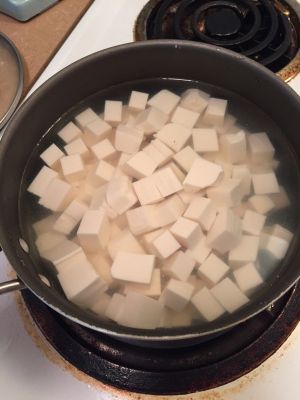 豆腐切丁,大点,接三分之一锅的水放豆腐,水开豆腐捞出放凉水浸泡(过水煮不容易碎)