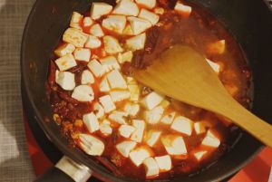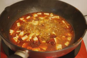 锅内放油,油热后加入底料,放入豆腐块炒,加入适量水,待水炖开收汁出锅