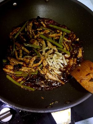 倒入鱼香汁,大火收汁快速翻锅,使鱼香汁沾到每个菜上,这里要注意鱼香汁倒入前需要搅动一下,不然淀粉等沉在碗底会影响效果。收汁完毕加入一点点香油就可以起锅了。