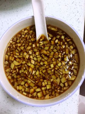 葱切花,姜,蒜剁茸,加淀粉、酱油,醋、耗油、糖、料酒,加些水,一起搅拌