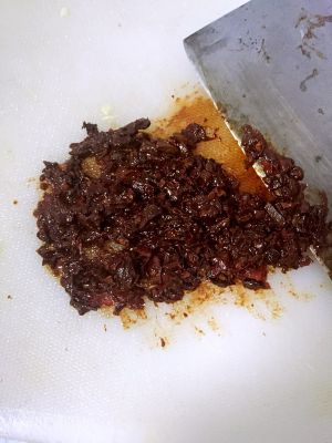 郫县豆瓣要用刀剁一下,越细越好,很多人其实不太会用郫县豆瓣,都是直接倒入,这样其实不入味,剁碎后的郫县豆瓣,吃的时候见不到大的豆瓣粒,也更美观。