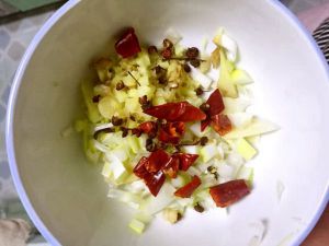 单独切一点姜蒜沫,葱花,一点干辣椒,几粒干花椒备用。