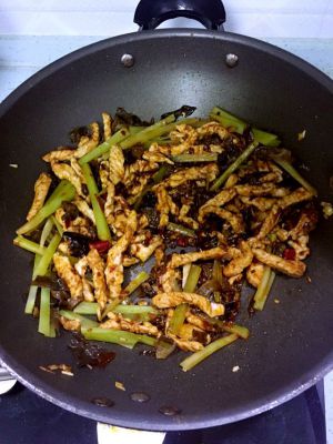 肉丝全变色后下入青笋和木耳,略微翻炒使调料均匀。