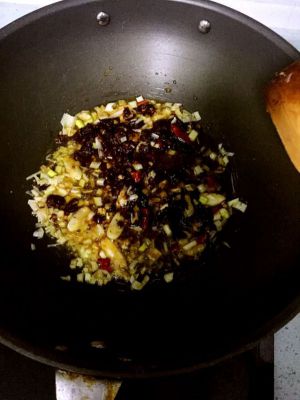 炝锅,用前面准备好的葱姜蒜干辣椒干花椒炝锅,出香后小火倒入郫县豆瓣,炒出红油。