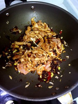 锅中加油,大火将油烧至七成热(七成热就是表面有青烟大量上升时),加入腌制好的肉丝,快速翻炒至肉丝发白,盛出备用