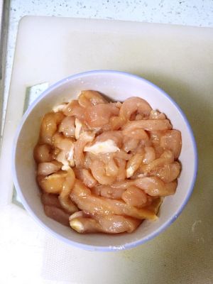 准备原料,猪通脊切丝,略微粗一些更好吃,用一点盐,料酒,鸡蛋清,淀粉腌制,加一点点小苏打,腌制半小时后,肉才嫩滑,小苏打可使肉质滑嫩,腌制时间越长越好,如果有时间,最好能腌制2个小时以上,可达到嫩肉粉效果。