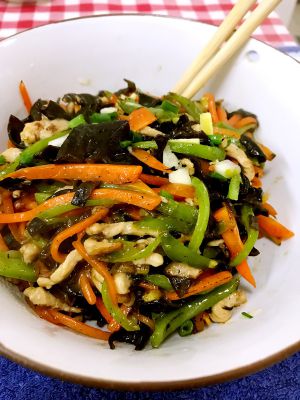 热锅,入油,油五分热时,倒入肉丝,炒散开至全部变色,加入胡萝卜丝,青椒丝,木耳丝,再加入2的调料,再炒一会儿就可以出锅了~因为妈妈不能吃辣,所以去掉了酸辣椒,如果喜欢吃辣的可以加在第2步中