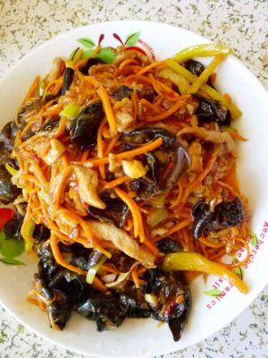 锅内倒油(稍微多一些),将肉丝炒至变色捞出,再次倒油(这次少些),小火将葱姜蒜末煸香,放入1勺半豆瓣酱,炒出红油,放入胡萝卜,青椒,木耳,变软后倒入肉丝翻炒