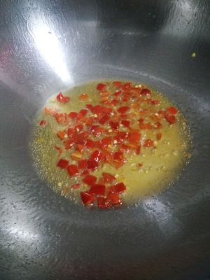 锅中注入植物油,热锅下油,微热后放入辣椒和葱、姜、蒜末翻炒出香味