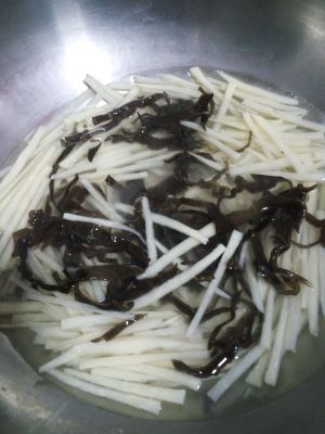 炒锅上火加清水、少许盐。水开后下入笋丝进行焯水,临出锅下入木耳丝划匀。